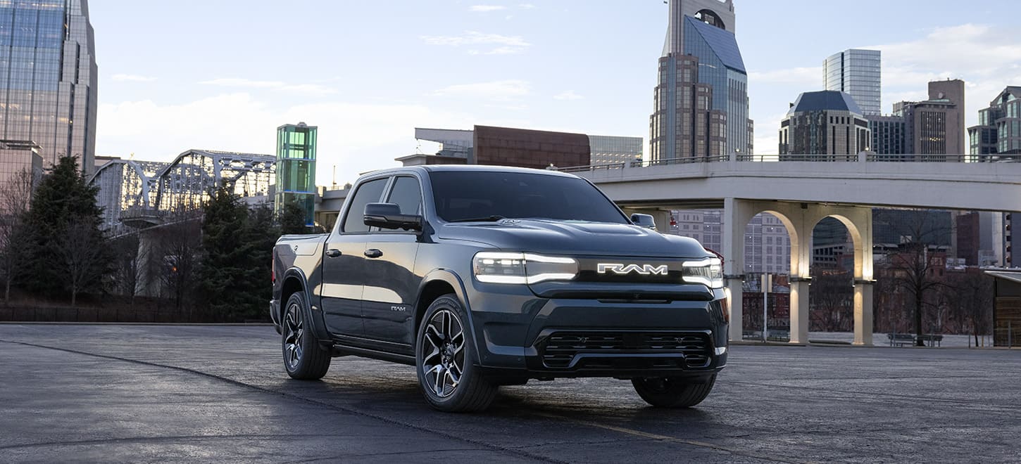 The Ram 1500 REV is the first fully electric Ram pickup truck, and it packs all the capability you expect from a Ram truck. The Ram 1500 REV produces up to 654 horsepower and 620 pound-feet of torque. The truck can tow up to 14,000 pounds and haul payloads of up to 2,625 pounds. A driving range of 350 miles comes standard, while a driving range of 500 miles is available. When you plug the Ram 1500 REV into a DC fast charging station, you can add about 100 miles of range every 10 minutes,